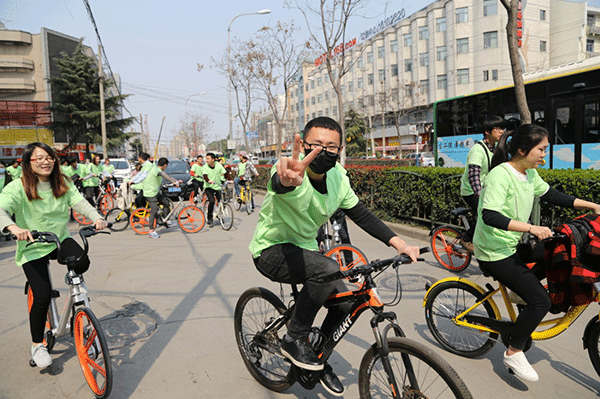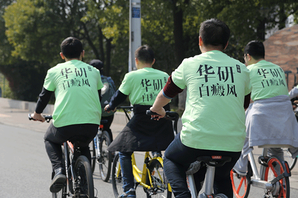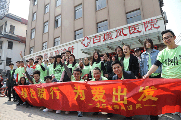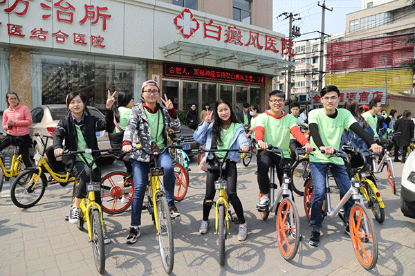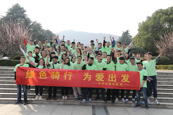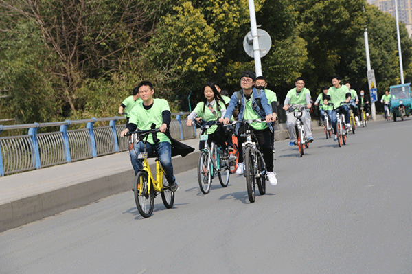3月7日下午12:50左右合肥華研白癜風醫院全體工作人員齊聚醫院門口,每個人都身穿統一的綠色T恤,人手一輛公共單車,等待出發的口令。拍照、留影是活動前必不可少的項目,下午的陽光很暖,進入相機里的他們笑意盈盈,蓄勢待發。